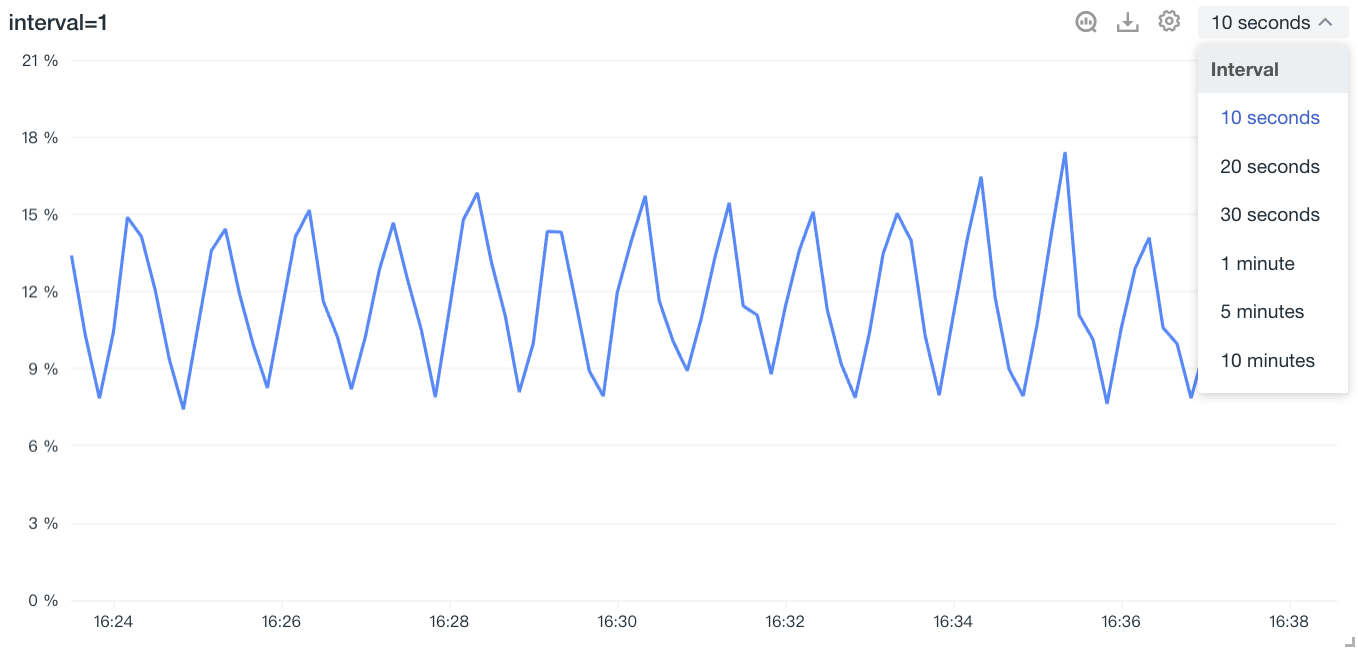 Execute the query according to the selected interval. When it conflicts with "Maximum Return Points", it will prioritize adjusting interval based on "Time Range / Maximum Points"; includes 10 seconds, 20 seconds, 30 seconds, 1 minute, 5 minutes, 10 minutes, 30 minutes, 1 hour, 6 hours, 12 hours, 1 day, 7 days, and 30 days.