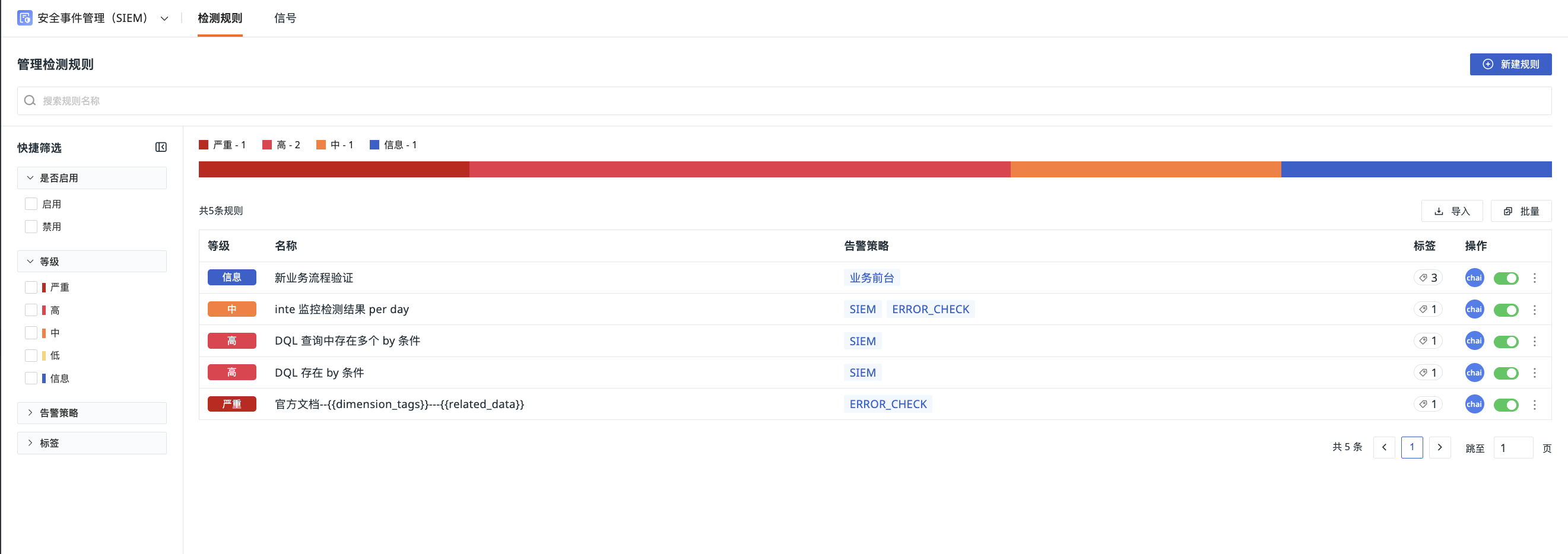 On the current page, you can intuitively understand the distribution of detection rules at each level through statistical charts. At the same time, you can view detailed information such as the rule name, associated alert strategy, and last update time in list form.